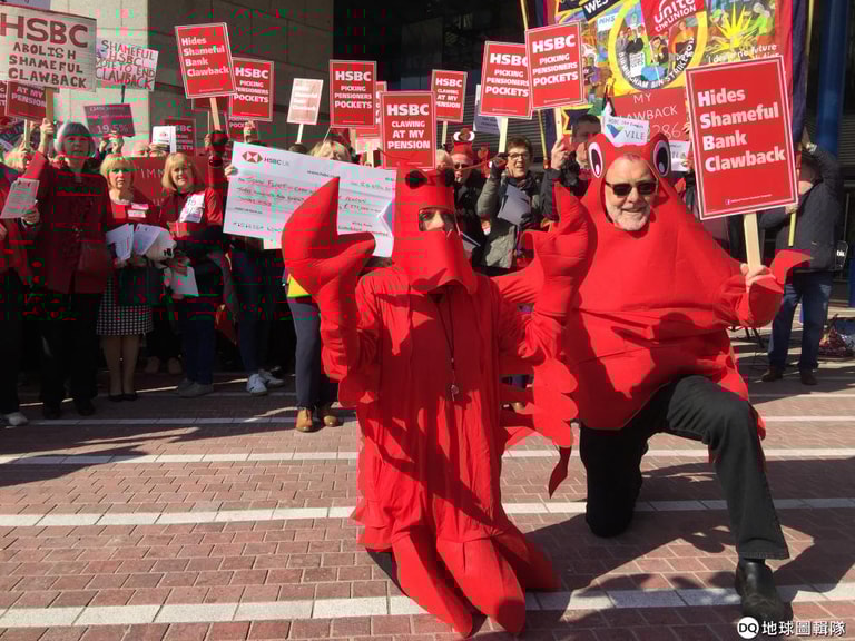 在伯明罕召開的匯豐銀行(HSBC)年度股東大會外,前匯豐銀行員工打扮成蝦兵蟹將,抗議銀行不公平地刪減他們的退休金。
