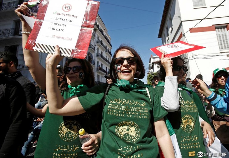 在首都阿爾及爾(Algiers),示威民眾穿著印有阿爾及利亞護照的T恤,上街要求政治改革以及打破傳統政治菁英的小圈圈。