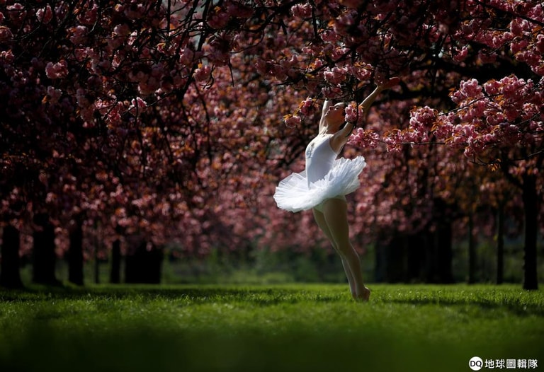 在巴黎近郊的國璽公園(Parc de Sceaux gardens),一名芭蕾舞者在盛開的櫻花下活動筋骨。