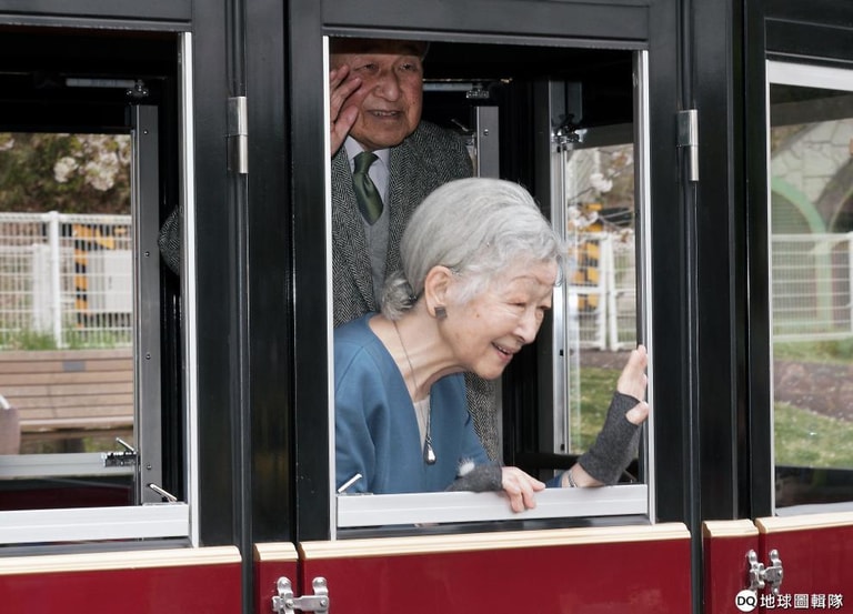在橫濱兒童樂園內,日本明仁天皇和美智子皇后搭著小火車向沿途的民眾揮手致意,慶祝兩人結婚六十周年。