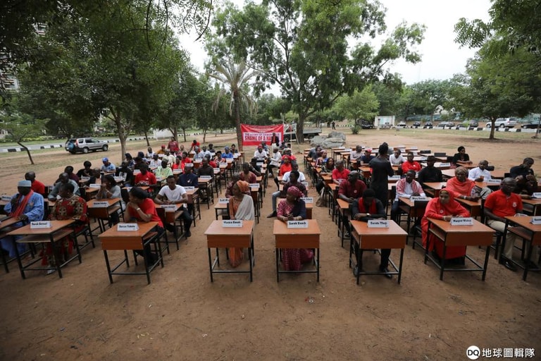 在首都阿布賈( Abuja),「帶回我們的女孩」(Bring Back Our Girls)組織的成員坐在放有失蹤女學生名牌的課桌上,希望下落不明的她們可以盡快回家,這天也是她們遭恐怖組織博科聖地(Boko Haram)綁架滿五周年。