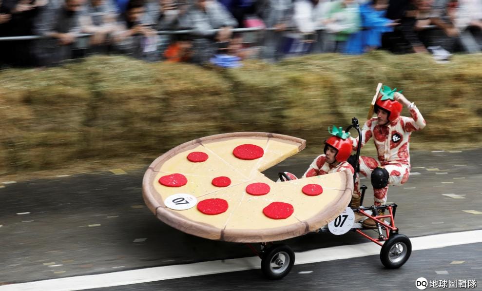 在南半球最大都市聖保羅(Sao Paulo),紅牛皂飛車大賽(Red Bull Soapbox Race)的參賽者各出奇招,其中一組參賽者就把自己打扮成了一塊披薩。