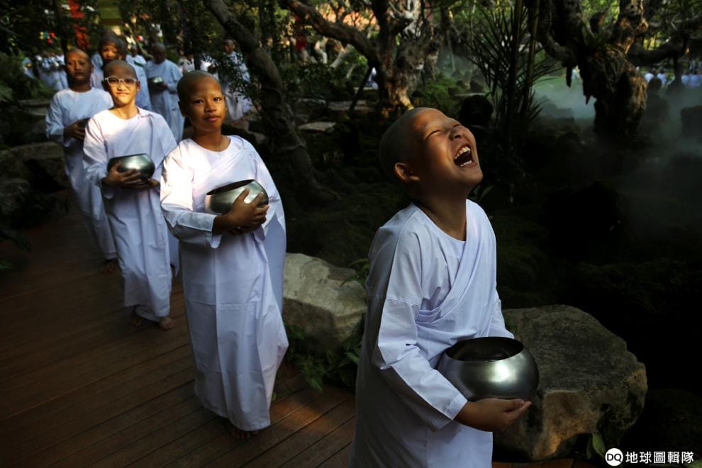 在曼谷的Sathira-Dhammasathan佛教冥想中心,小尼姑們捧著碗在泰國新年潑水節(Songkran,也稱宋干節)時化緣。