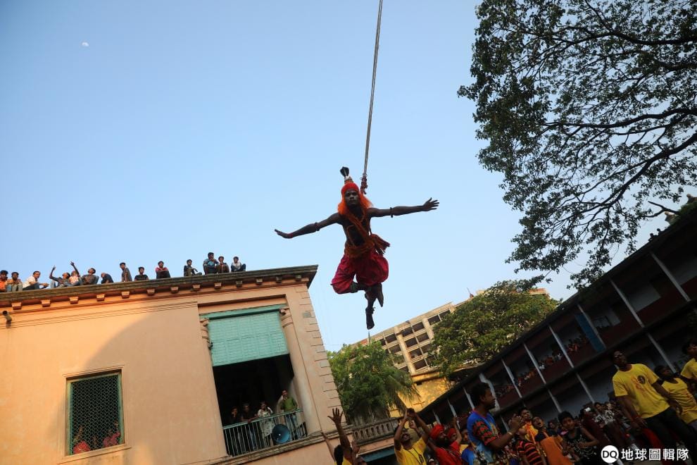 在首都達卡(Dhaka),一名印度教聖人吊著鋼絲,慶祝Charak Puja節,這個節日是專為印度教神衹濕婆神(Shiva)而設。
