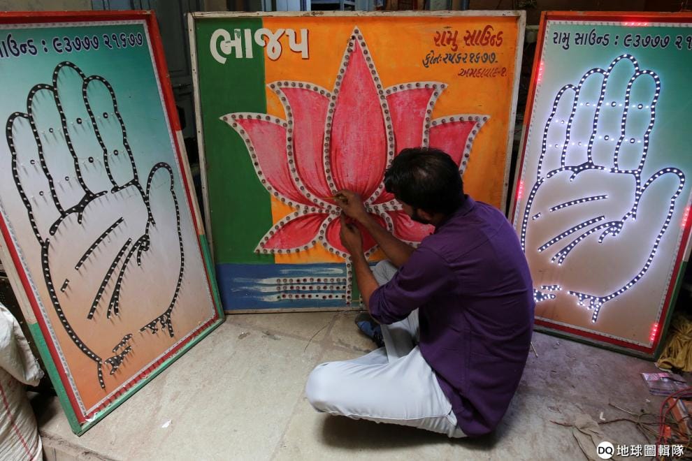 在印度第七大城艾哈邁達巴德(Ahmedabad),一名電工正在調整印度執政黨印度人民黨(Bharatiya Janata Party,BJP)的蓮花黨徽告示牌,一旁則是在野黨印度國民大會黨(Indian National Congress)的五指黨徽。
