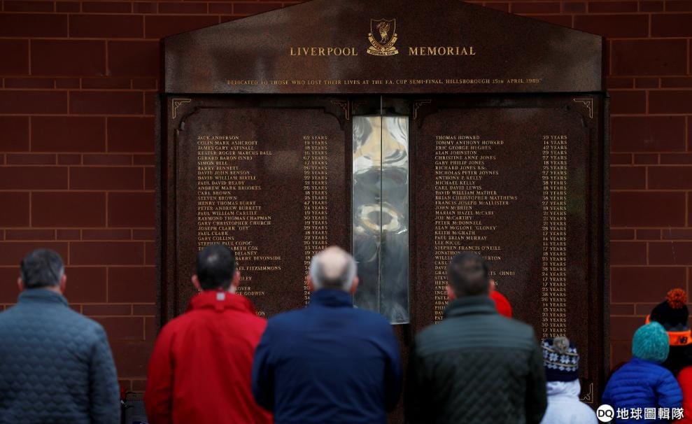 民眾聚集在利物浦(Liverpool)的安菲爾德球場(Anfield Stadium)外,看著球場設置的希爾斯堡足球場踩踏事件(Hillsborough Disaster)紀念碑悼念。