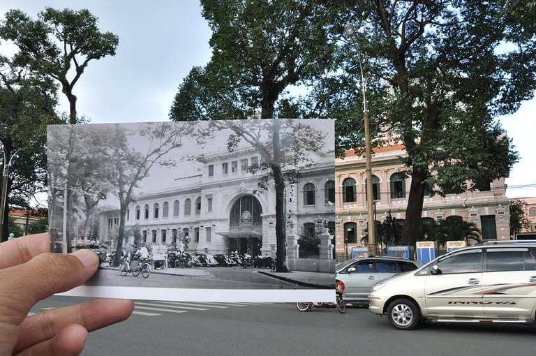 位在西貢河附近的西貢中央郵局就是法國殖民時期留下的最具代表性的標誌之一。西貢中央郵局的建築於 1891年落成,外型酷似巴黎的舊時代商場,杏色外牆、浮雕裝飾的牆柱、自天窗灑下的陽光,人稱「亞洲最美郵局」的種種細節彷彿將時光凝結在過去。