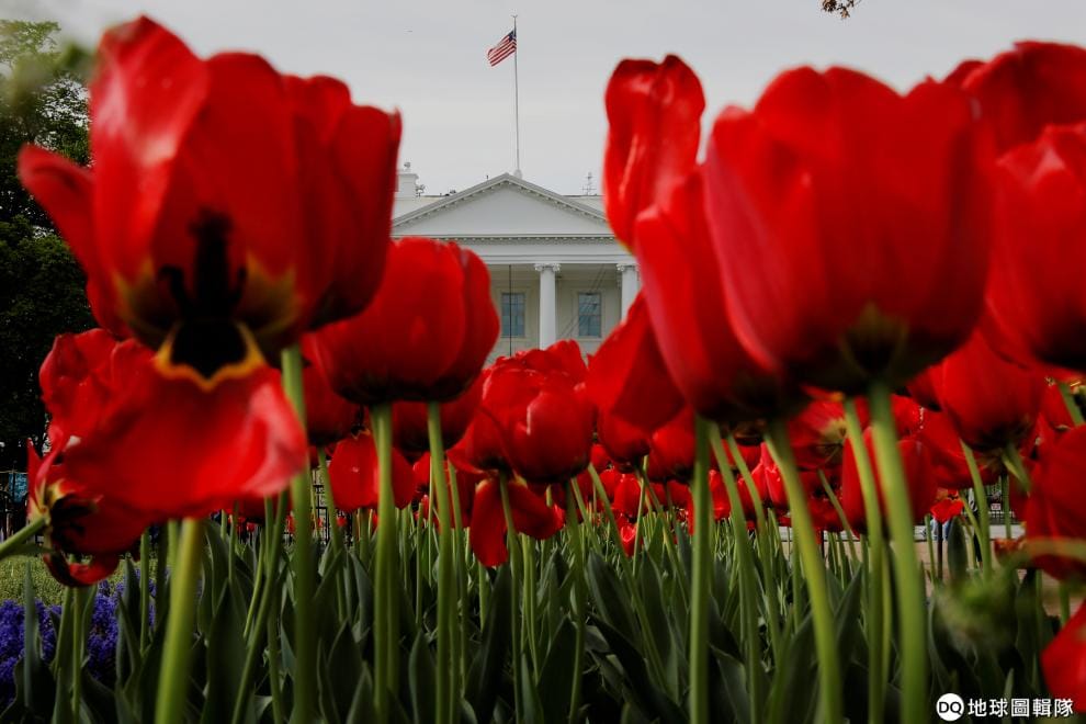 在位於華盛頓特區的白宮,前方一片盛開的紅色鬱金香令人賞心悅目。