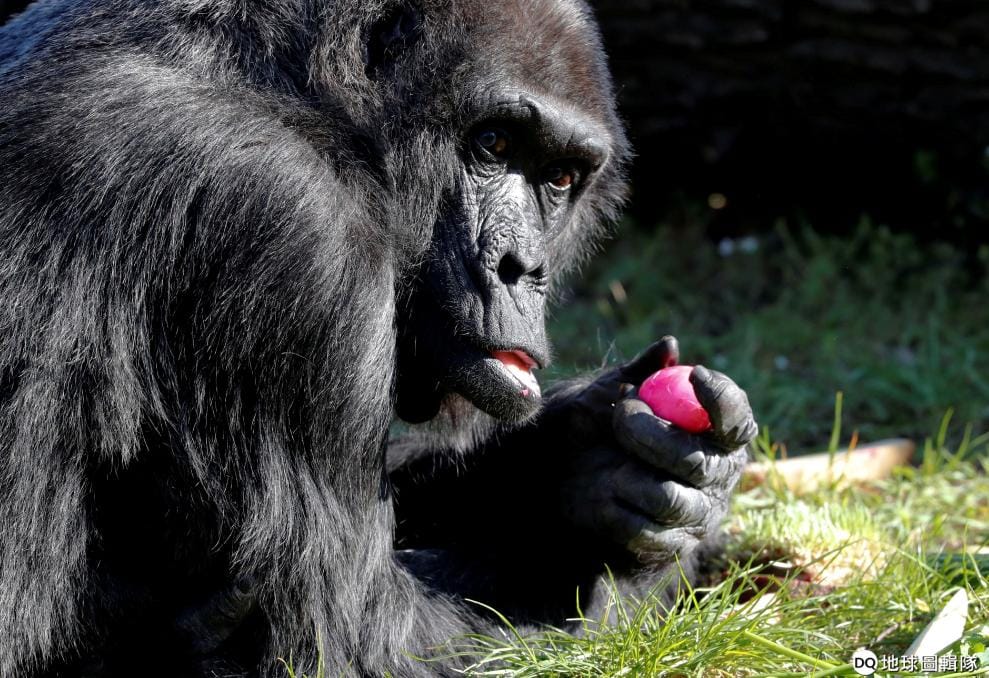 在柏林動物園內,一隻西部低地大猩猩手拿煮熟的復活節彩蛋,好奇地準備吃吃看。
