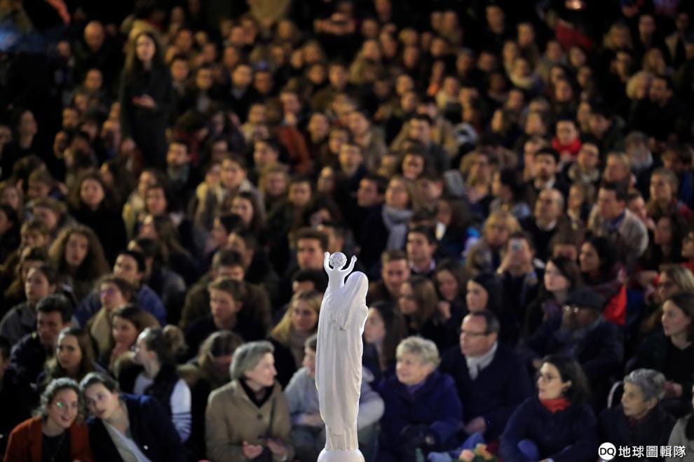 在巴黎聖米歇爾廣場(La place Saint-Michel)上,民眾齊聚一堂為遭到祝融之災的巴黎聖母院祈禱。