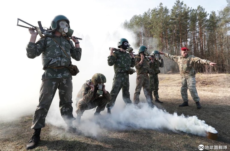 在白羅斯內政部特勤部門服務的成員,為了爭取加入內政部的菁英部隊「栗色貝雷帽」(Maroon Berets),戴著防毒面具正在進行一連串的考驗。