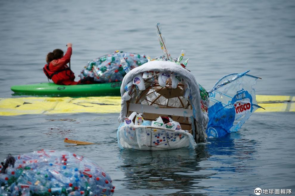 在位於沃韋(Vevey)的雀巢(Nestle)集團總部,綠色和平組織的成員在總部前方的萊芒湖(Lake Leman)上抗議,呼籲雀巢減少用一次性塑膠來包裝產品。