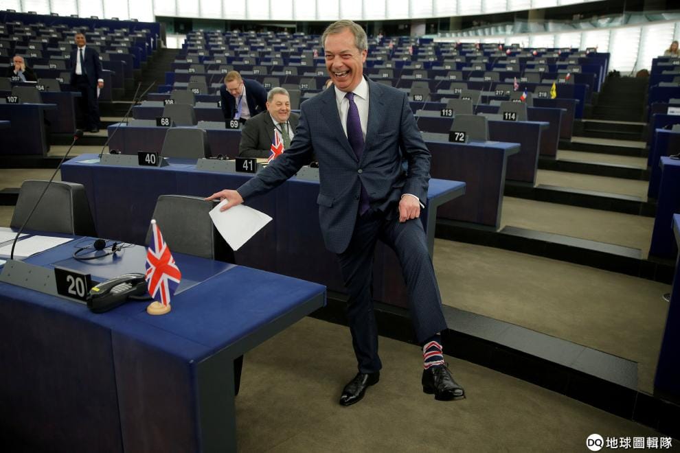 在史特拉斯堡(Strasbourg)召開的歐洲議會上,大力支持英國脫歐的議會成員法拉吉(Nigel Farage)拉起褲管,秀出他腳上的特色襪給大家看。