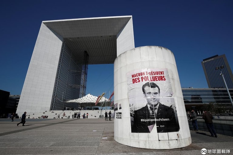 在巴黎新凱旋門前,環保運動人士貼上了印有法國總統馬克宏(Emmanuel Macron)的海報,搭配「馬克宏,汙染者的總統」,批評他在對抗氣候變遷上做得不夠多,藉此呼籲各國領導人盡快行動、保護地球。