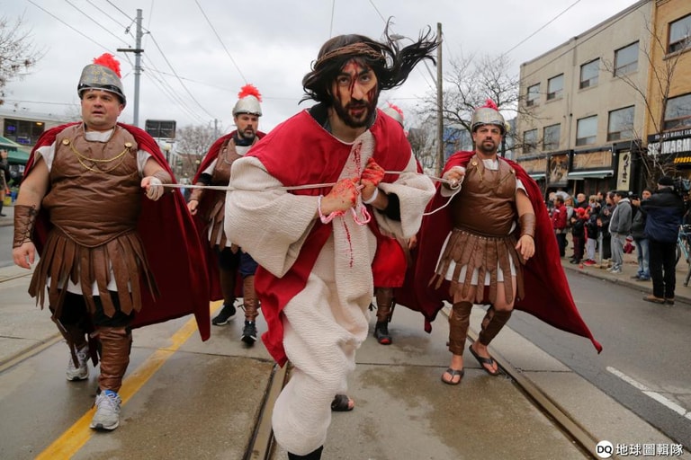 在多倫多紀念耶穌受難日的活動上,打扮成耶穌和羅馬士兵的演員重現了耶穌走向刑場、要被釘上十字架的場景。