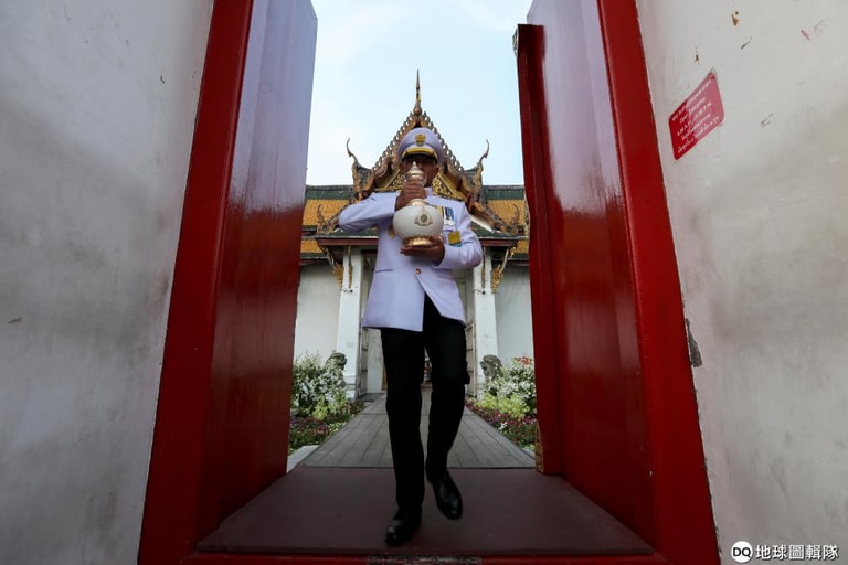 為了迎接下個月 4-6號舉辦的泰皇加冕典禮,各地紛紛將從河流與湖泊採集到的聖水送到曼谷大皇宮,圖中工作人員手捧的聖壺裡裝的就是聖水。根據規定,泰國王儲瓦吉拉隆功(Maha Vajiralongkorn)在用完聖水沐浴、接受聖器和戴上皇冠後,才算真正的泰皇。