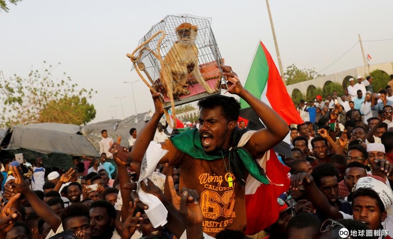 在首都喀土木(Khartoum)的國防部前,一名男子高舉一隻被關在籠子裡的猴子,象徵前總統巴席爾(Omar Al-Bashir)。他和其他民眾呼籲要嚴懲已經下台的巴席爾以平民怨。而在巴席爾下台後,軍方宣布他們將以軍方領導的過渡委員會協助維護社會穩定。巴席爾從 1989年開始統治蘇丹,這幾個月來不斷遭到民眾示威抗議。原本民眾上街是為了抗議物價不斷飆高,但隨著對經濟民生的不滿演變成對執政者的憤怒,現在他們改要巴席爾下台負責。