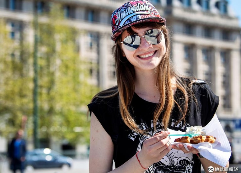 在首都布魯塞爾一個陽光燦爛的日子,一名女子開心地享受著名的比利時鬆餅。