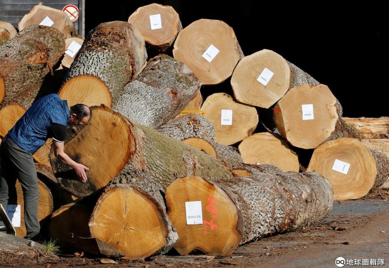 在法國中部的一處橡木場內,負責人羅伯特(Bertrand Robert)正在檢查場內擺放的巨大橡木。