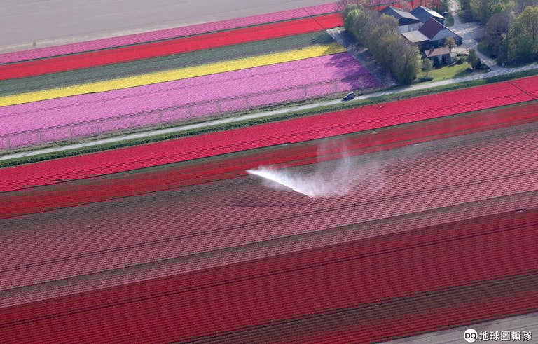 從空中俯瞰位於荷蘭北部的克萊爾(Creil)鬱金香花田,五顏六色的花朵組合成了一幅美麗的景色。