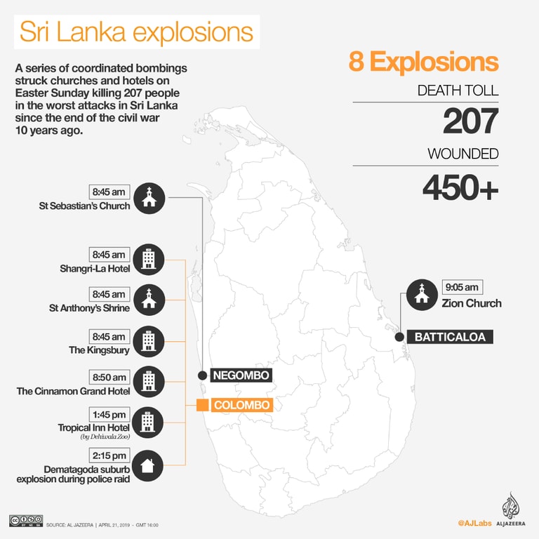 根據最新消息,周日(21)發生在斯里蘭卡的八起爆炸案造成至少 290人死亡,超過 500人受傷,目前尚無人出面宣稱犯案,不過警方已經逮捕 24名嫌犯,作案地點包含三間教堂、四間飯店以及一間民房。這八起爆炸攻擊是自 10年前斯里蘭卡內戰結束後,死傷最慘重的攻擊事件。