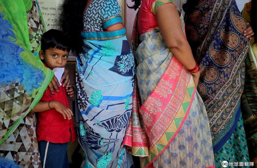 在馬哈拉施特拉邦(Maharashtra)的文化首都浦那(Pune),一名小男孩跟著準備參與印度下議院大選的家人一起排隊。