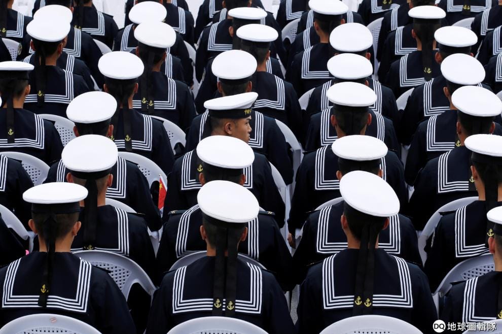 在山東省青島港,中國人民解放軍海軍穿著水手服、頭戴白色海軍帽,慶祝海軍成立滿 70周年。