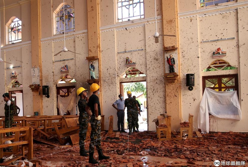 在遭到炸彈攻擊的內貢博(Negombo)聖賽巴斯提安天主教堂(St. Sebastian's Church),從畫面中可以看到屋頂受到爆炸威力影響被炸碎,地上一片狼藉,牆上則充滿罹難者噴灑的血跡。