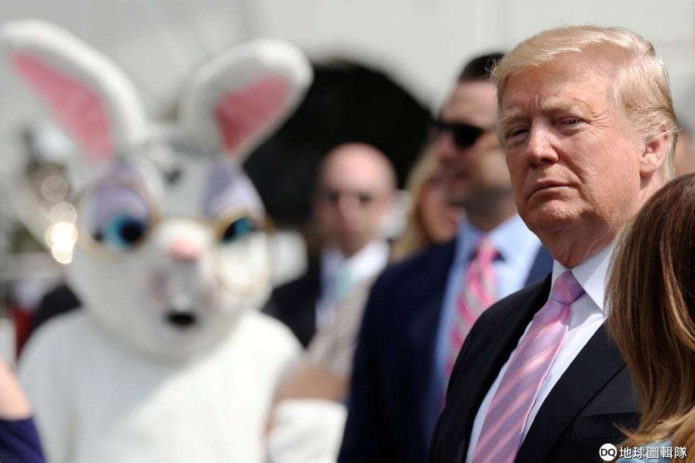 在白宮南面草坪上,美國總統川普(Donald Trump)準備參加一年一度的白宮復活節滾彩蛋(White House Easter Egg Roll)活動,一隻應景的復活節兔子瞪著他看。