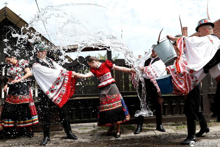 在匈牙利東北部的邁澤克韋什德小鎮(Mezokovesd),當地男子穿上傳統服飾朝女子潑水,藉此慶祝復活節的到來,女子隨後得回贈復活節彩蛋給男子。這種慶祝方式在當地由來已久,最早可追溯至西元 200年。據說,最初不是潑水,而是直接把女子拉到河邊或水池把她們泡進水中,除了慶祝復活節外,也歡慶生機蓬勃的春天。