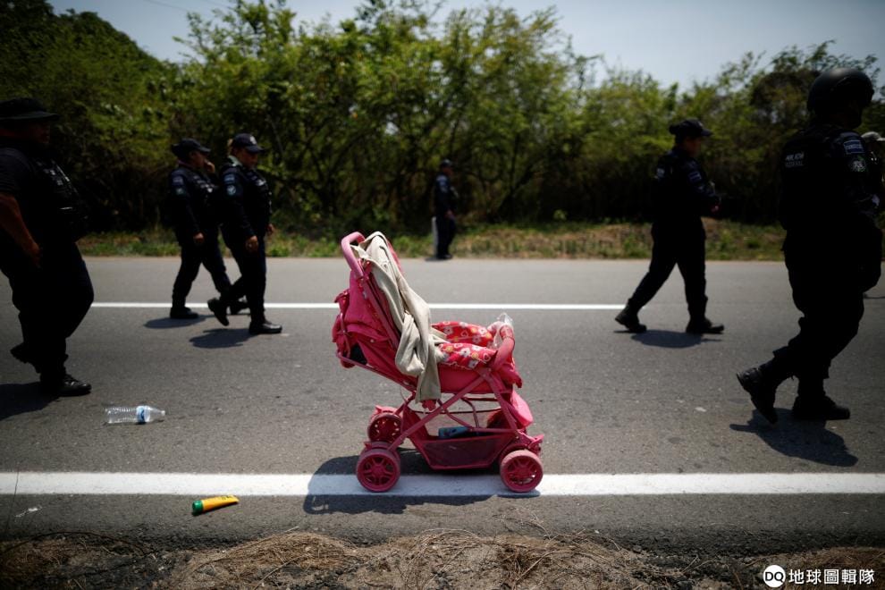 在墨西哥恰帕斯州(Chiapas)的皮希希亞潘(Pijijiapan)小鎮,一部空蕩蕩的嬰兒車被留在「車隊移民」(Migrant Caravan)必經的路上。