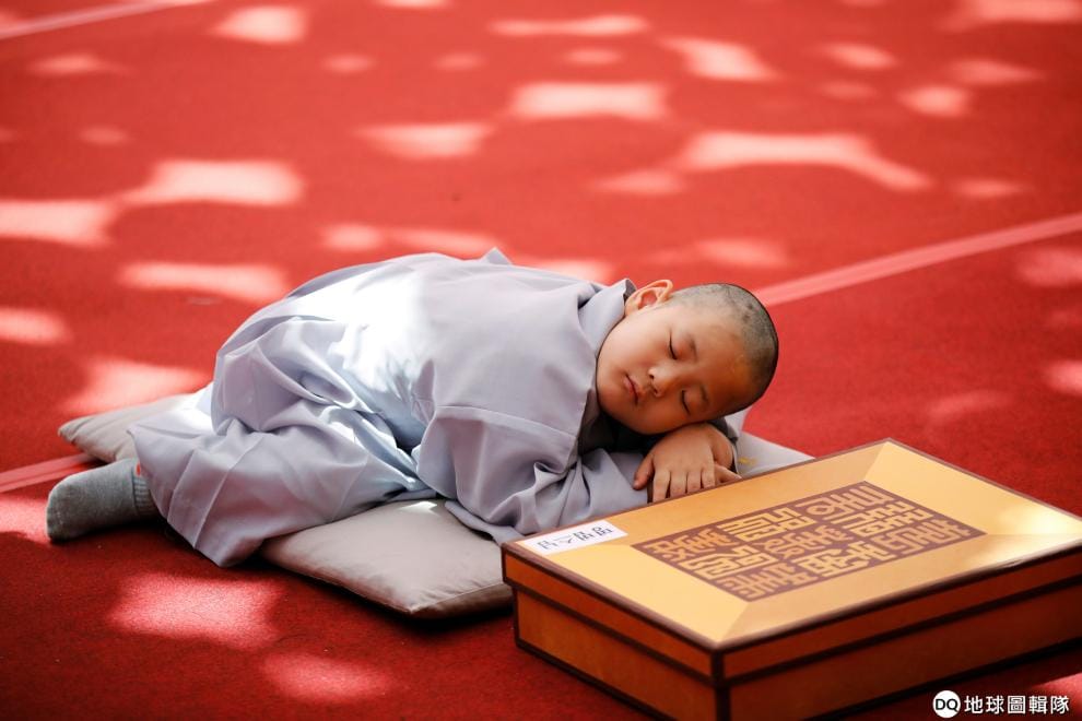 在首爾曹溪寺,一名剛剃完髮的小沙彌趴在墊子上休息,這個剃髮儀式是為了慶祝即將到來的佛誕節(Vesak Day)。