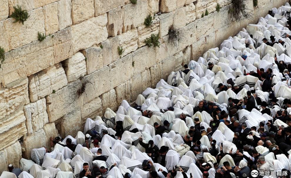 在耶路撒冷的猶太教聖地哭牆前,猶太教信徒們披上披肩禱告,這是逾越節(Passover)儀式中重要的一環。