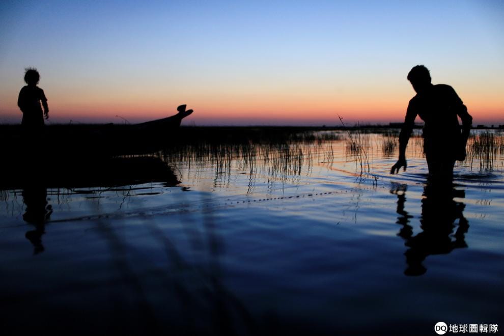 在擁有兩河文明的濟加爾省(Dhi Qar province),當地漁夫正在Chebayesh沼澤中捕魚。