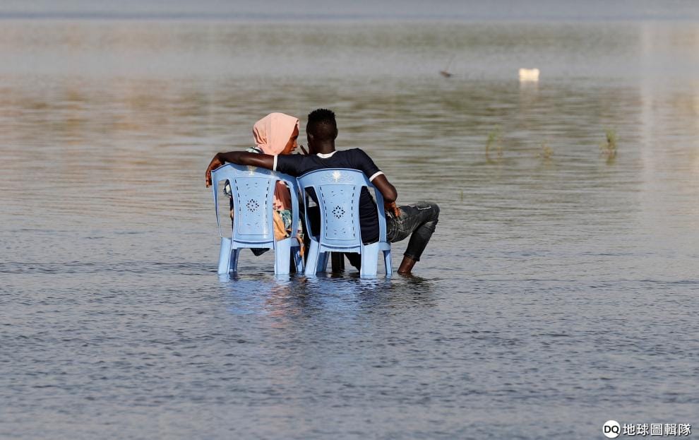 在首都喀土木(Khartoum),一對情侶將腳泡在尼羅河中消暑。