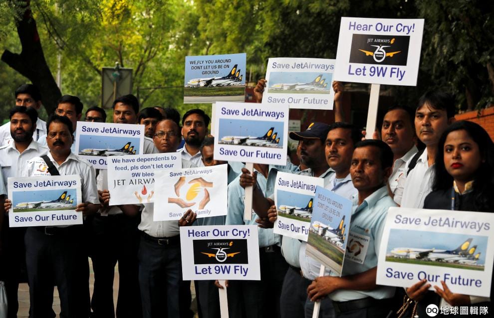在新德里,印度捷特航空(Jet Airways)的員工走上街頭,希望大家可以一起幫忙拯救捷特航空,不要讓它面臨消失的命運。印度捷特航空是印度國內線規模第二大的航空公司,然而因為資金問題,在 4月17日宣布停飛,等待有興趣的國際投資人接手。