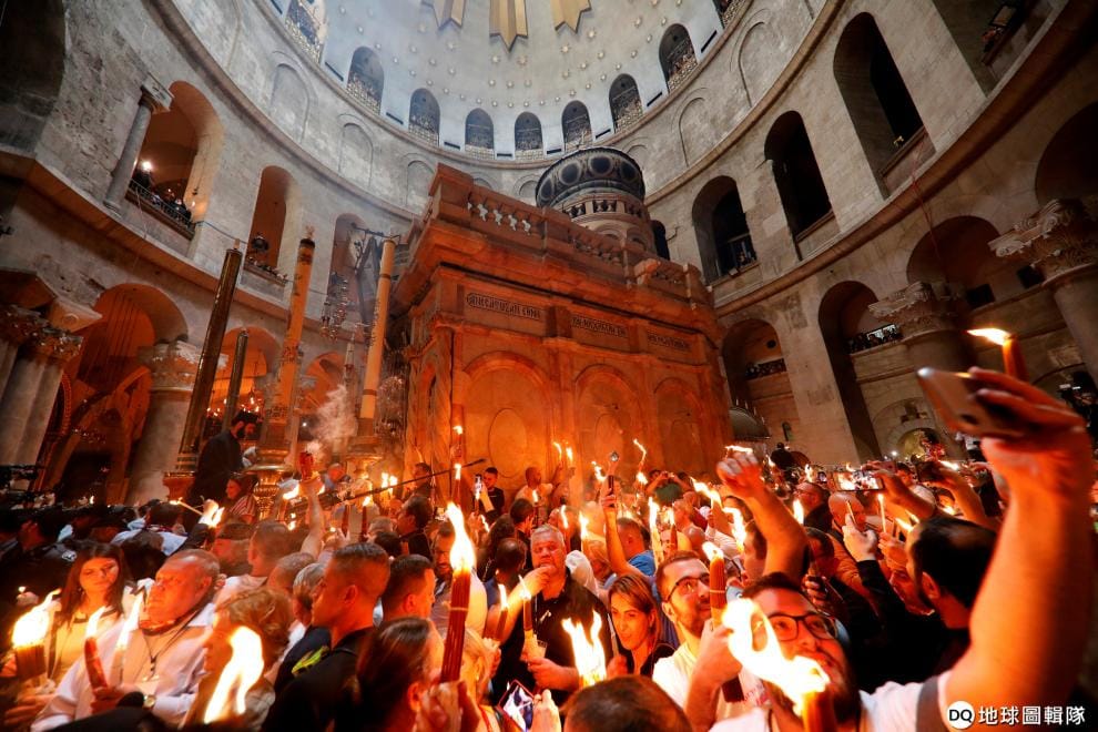 在位於耶路撒冷舊城區的基督教聖墓教堂(Church of the Holy Sepulchre),信徒們正在參加一年一度的聖火儀式。當地不少信徒認為,聖墓教堂就是耶穌基督被釘死在十字架的地點,且耶穌基督的聖墓也在教堂內。