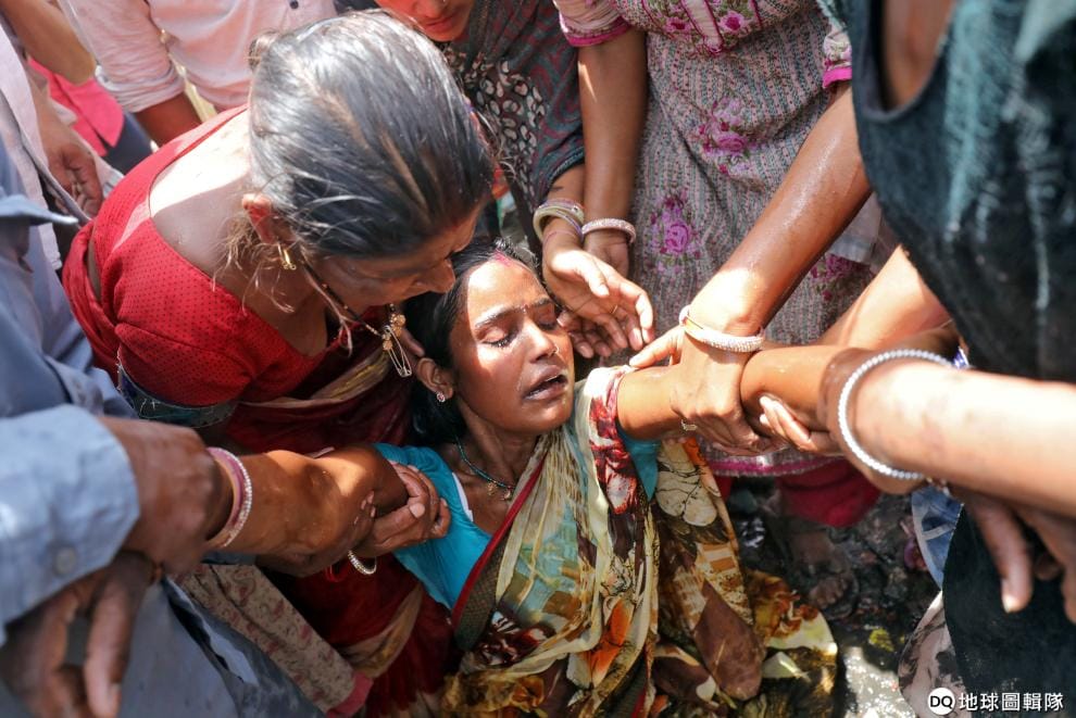 在新德里的一處貧民窟,一名女子看著眼前的家園被大火吞噬暈了過去,一旁的民眾趕緊攙扶她。這場大火至少吞噬了 40棟棚屋,當局正在調查起火原因。