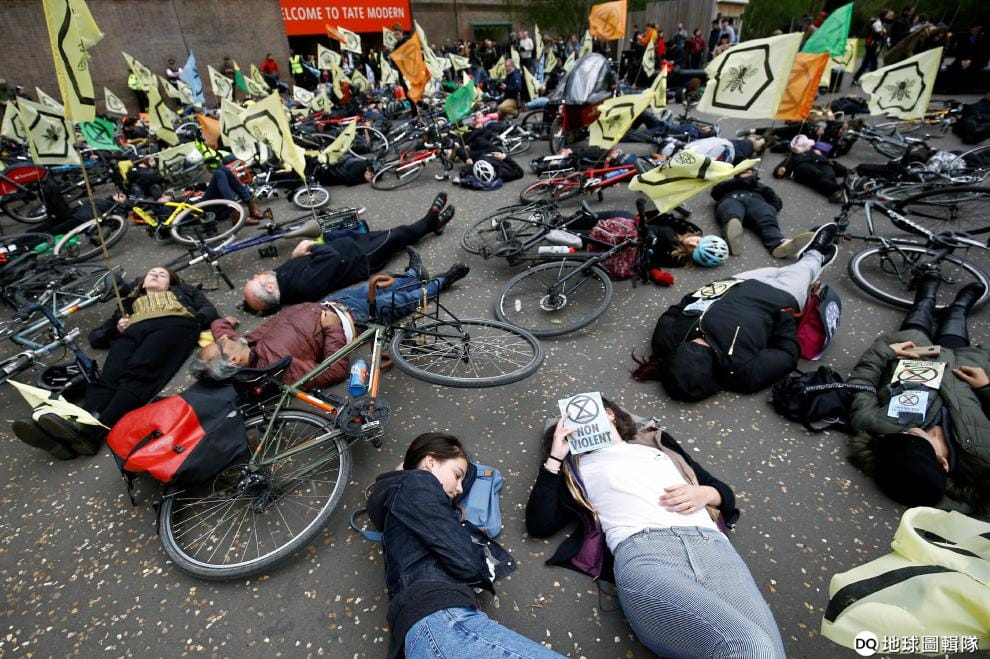 在倫敦泰特現代美術館(Tate Modern)前,參與氣候變遷示威活動「滅絕反叛」(Extinction Rebellion)的單車騎士躺在地上,表達自己的訴求。