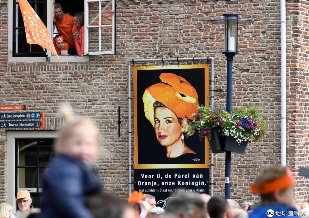 在荷蘭中部的阿默斯福特市(Amersfoort),當地正在慶祝國王節(Koningsdag)的到來,民眾也發揮創意替荷蘭麥西瑪王后(Queen Maxima)戴上了橘子皮,海報上寫到:「橘子上的珍珠,我們的王后,這個獻給妳。」