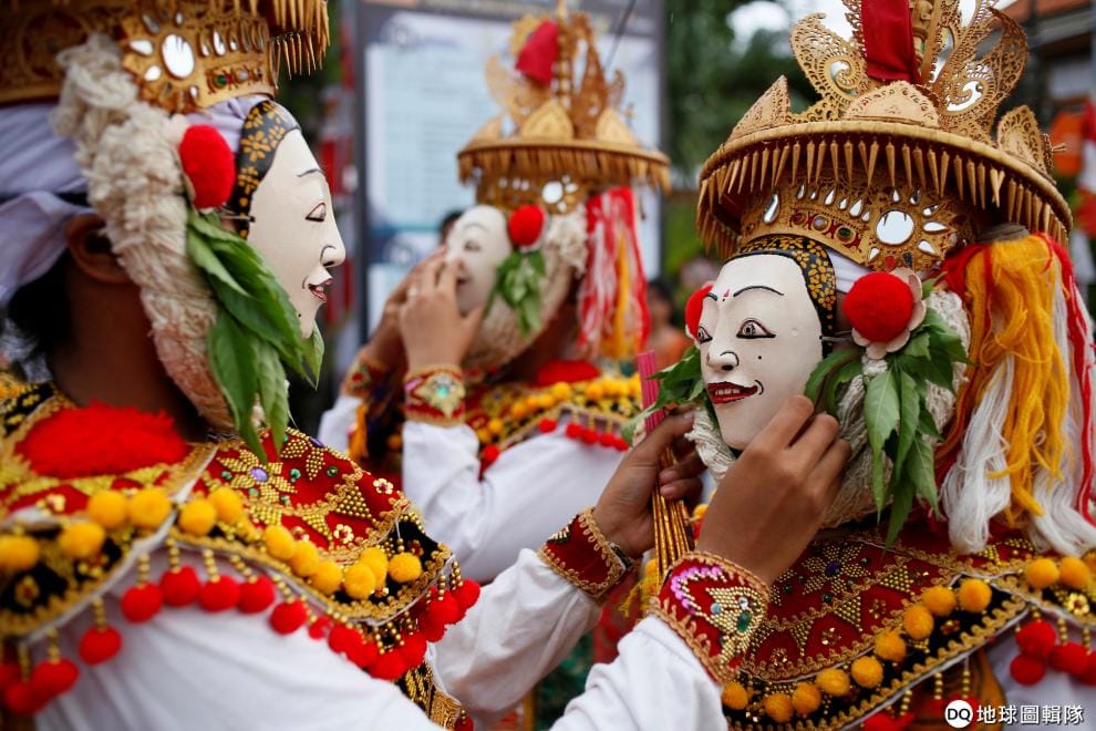 在印尼觀光勝地峇里島,印度教舞者為彼此戴好面具,準備上場表演宗教舞蹈Telek舞。