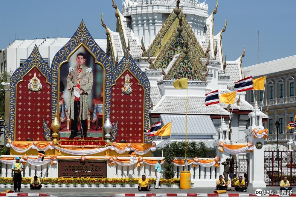 為了迎接即將在下個月 4-6號舉辦的泰皇加冕典禮,工作人員正在巨大的泰國王儲瓦吉拉隆功(Maha Vajiralongkorn)的照片前彩排。