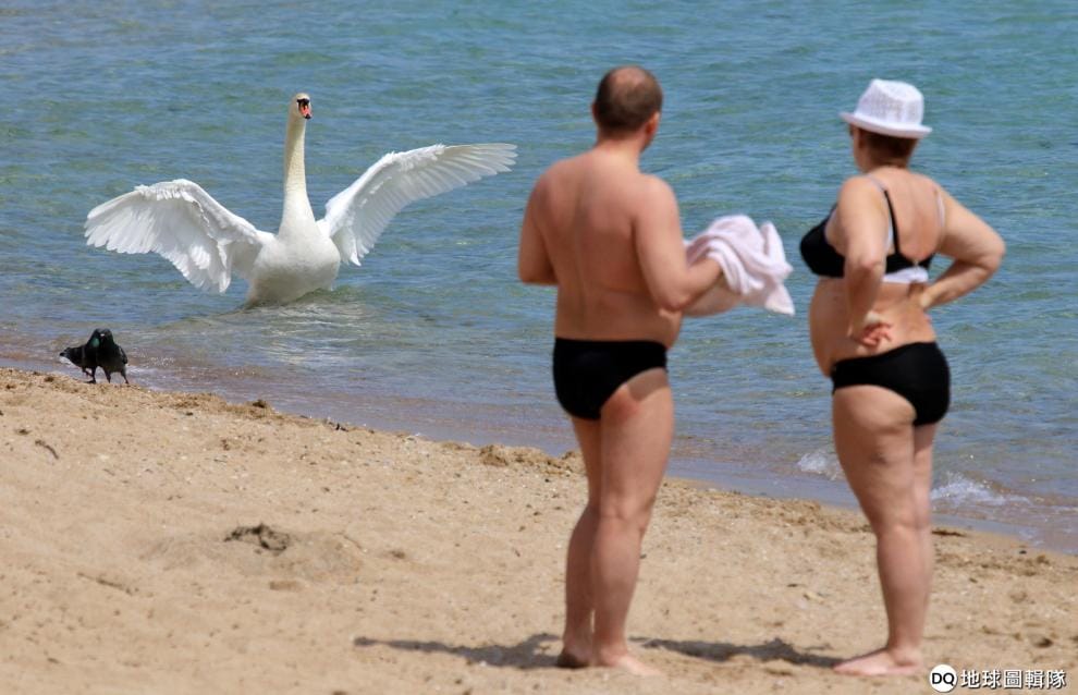 在黑海港口Yevpatoriya的海灘上,泳客看著一隻雪白的天鵝展翅。