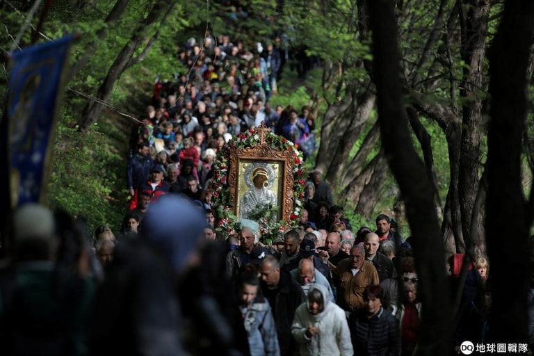 在靠近Bachkovo修道院周邊,東正教信徒們扛著聖母瑪莉亞的肖像參加復活節遊行。