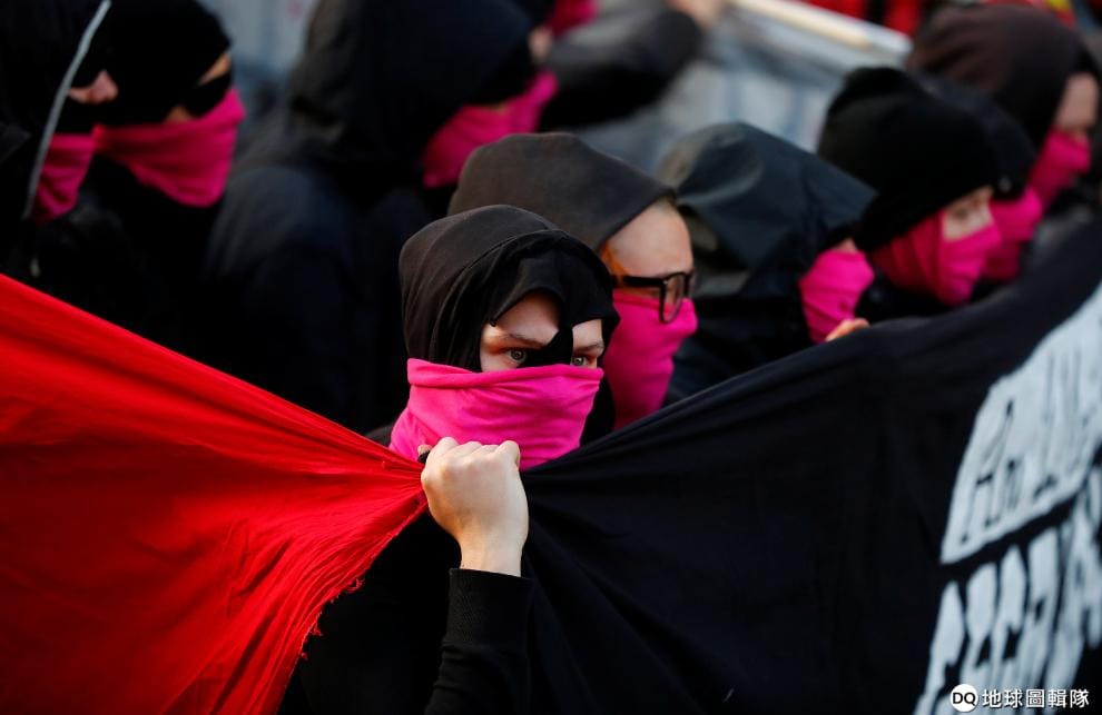 在柏林街頭,參加五一勞動節抗議的民眾全副武裝、圍著桃紅色的毛巾上街喚起大眾對勞權的注意。