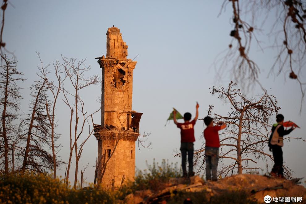 在北部城市阿勒坡(Aleppo city),孩子們在被破壞的 14世紀Al-Tawashi清真寺尖塔旁玩耍。