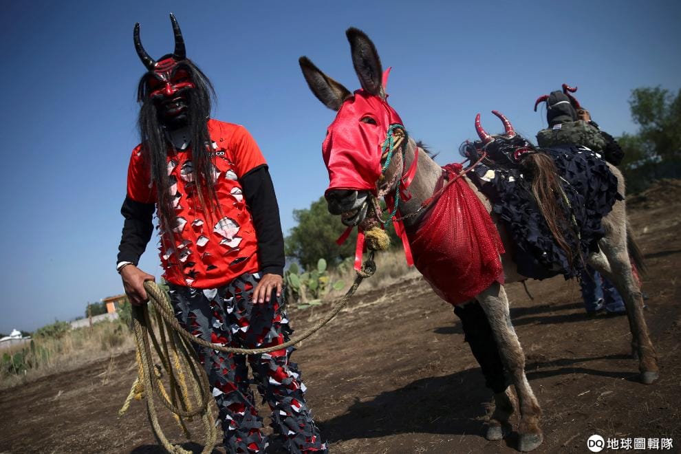 在墨西哥市一年一度的驢子節上,一名男子戴上惡魔面具、牽著他的驢子一起歡慶這一天。