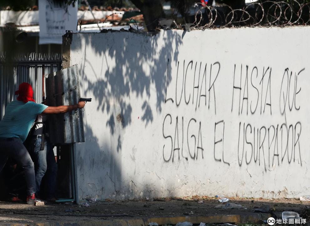在首都卡拉卡斯,反對現任總統馬杜洛(Nicolas Maduro)的民眾上街抗議,其中一人舉起手槍瞄準寫有「戰鬥到篡位者離開」字樣的塗鴉牆。
