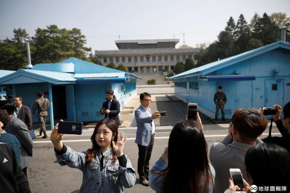 在南北韓交界的板門店(Panmunjom)停戰村,來自南韓的觀光客興奮地拍照,記錄下這難得的一刻,畢竟每天開放的觀光名額有限,且參觀時服裝儀容等都有規定。