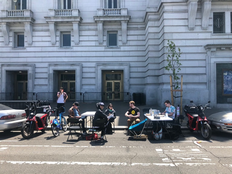實驗成功後,他將停車格工作的經驗分享到Twitter上,並號召志同道合的自由工作者一起加入這個行動。本周一(29),大概有 30人加入他的露天辦公室,一起在舊金山市政府旁的路邊用幾張桌椅設立了露天辦公室。現在,彭提斯和一群支持者決定認真推廣「#WePark」行動,呼籲大眾重視舊金山高房價所帶來的問題和生活壓力。